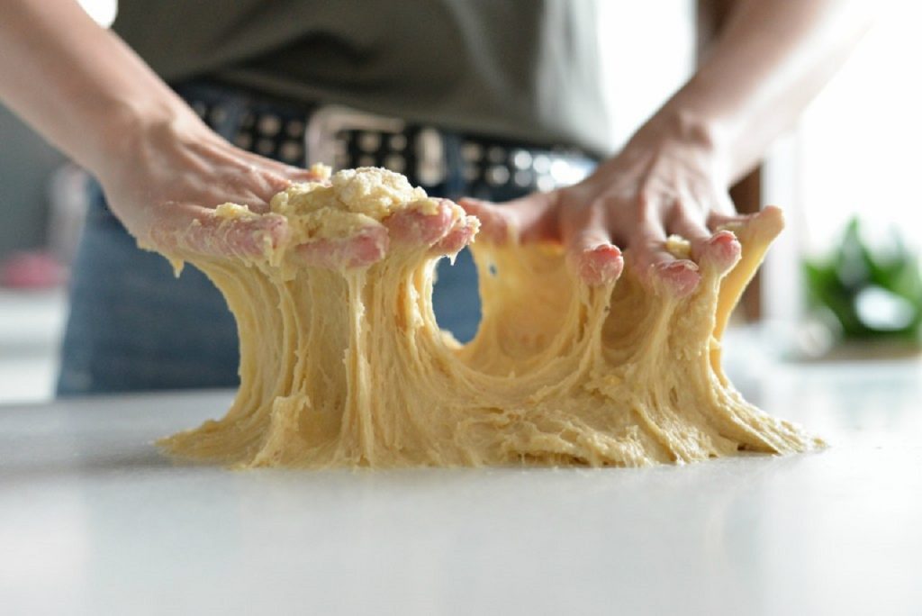 Изкарвате тестото от купата и започвате да го месите на плота, като постепенно изливате по малко от останалата мазнина там и чрез месене я вкарвате в тестото. Това е втората важна стъпка за получаването на така наречените “конци”. При продължителното месене се активира глутенът, който въпреки, че напоследък е взет на мушка от много хора, е виновникът за любимото ни сладко и пухкаво тесто. Това беше “най-трудната” част от рецептата. Оттук нататък има много чакане, говорене на тестото и нетърпеливо кръжене около фурната. Тестото се слага в чиста купа намазана тънко с олио, покрива се с чиста кърпа и се слага на онова топло място, където до преди малко е шупвала маята. И така докато удвои обема си – около 1 час.