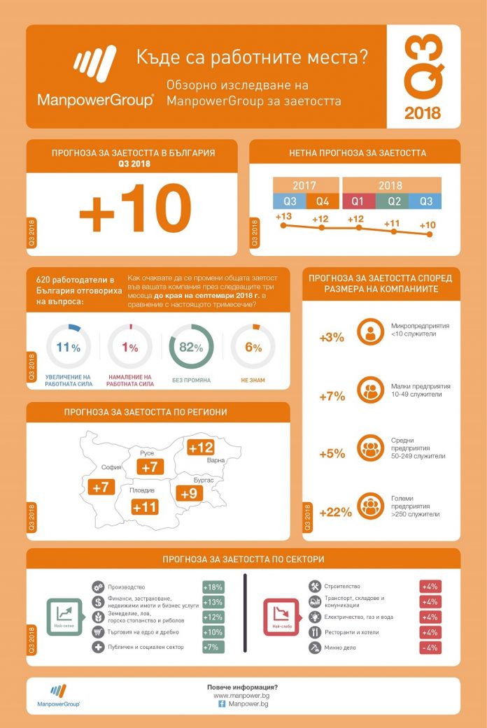 Обзорното изследване на ManpowerGroup за заетостта за третото тримесечие на 2018 г. беше проведено под формата на интервюта сред представителна извадка от 620 работодатели в България. Всички анкетирани отговориха на въпроса „Как очаквате да се промени общата заетост във вашата компания през трите месеца до края на септември 2018 г. в сравнение с настоящото тримесечие?“. Българските работодатели отчитат скромни намерения за наемане на служители през следващото тримесечие. 11% от тях очакват да увеличат нивата на заетост, 1% предвиждат да ги намалят и 82% не прогнозират промяна. Така нетната прогноза за заетостта става +10%.
