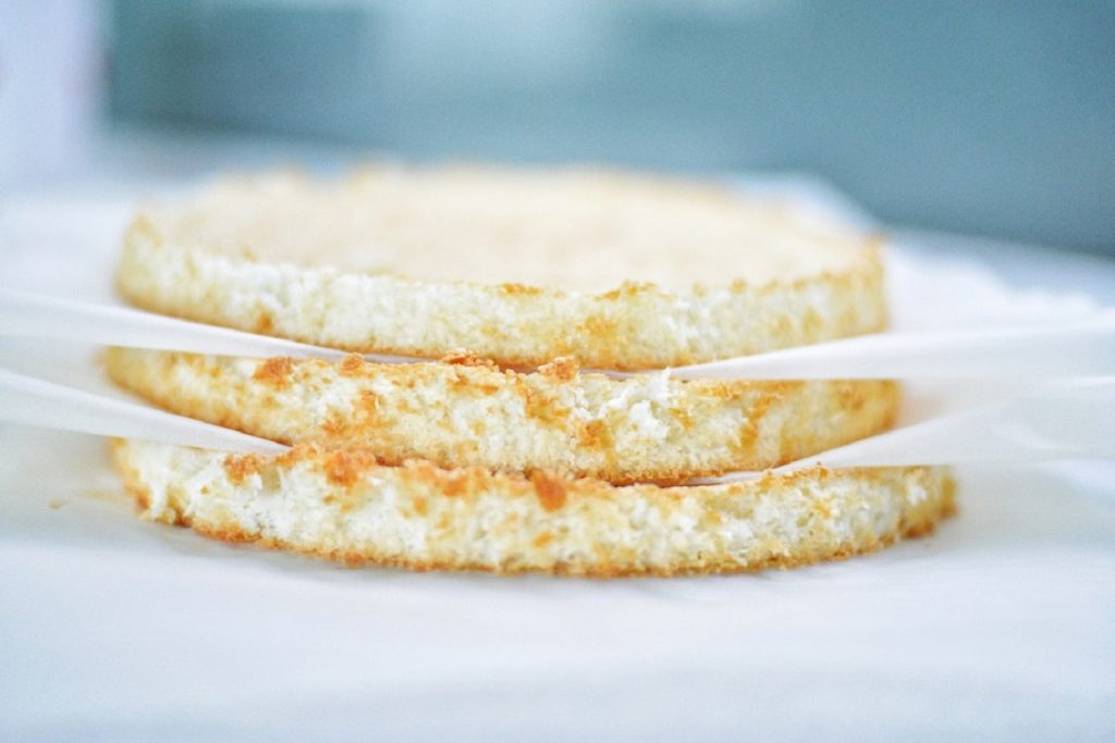 Фурната се загрява на 170 градуса. Белтъците се избиват със захарта до твърди връхчета и към тях се добавят внимателно с помощта на шпатула кокосовите стърготини. Тавата се застила с хартия за печене, а сместа се изсипва в метален ринг с диаметър 22 см. Можете да загладите с лъжица и да махнете ринга – сместа е достатъчно твърда, за да не се разтича настрани. Печете около 10-12 минути, докато не порозовее. След това слагате на решетка да изстине блатът напълно. Това се повтаря за всеки един от трите блата.