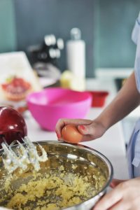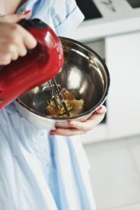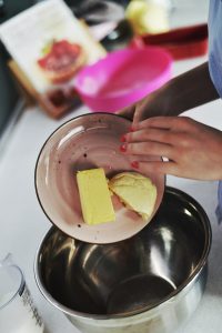 Фурната се загрява на 180 градуса. Маслото трябва да е леко размекнато. Смесвате го заедно със захарта в купа и го разбивате с миксер за 1-2 минути докато сместа стане по-бяла и пухкава. След това започвате да добавяте яйцата едно по едно като след всяко яйце разбивате отново с миксера докато видите, че яйцето е напълно усвоено. На два пъти добавяте прясното мляко.