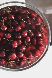 Черешите трябва да се пасират заедно с ментата. Изчакайте с пасирането на черешите докато не ви изстине напълно сиропът. Ако избързате при контакта с въздуха пасираните череши започват да потъмняват много бързо.