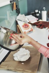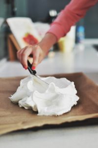 Финалната стъпка е оформянето на гнездото. Белтъкът се изсипва върху хартия за печене и с помощта на шпатула или лъжица се оформя гнездо с диаметър около 22 см, както е показано на снимките. Добре е в средата да се направи по-ниско отколкото ръбовете, за да може да се сложи там кремът.