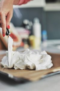 Меренгето за основата се приготвя по същия начин както и меренгето за целувки, което можете да видите тук. Единствената разлика е, че целувките се шприцоват в определена форма и се сушат докато станат хрупкави. Тук цялата смес се оформя като гнездо и се слага да се суши за същото време, както и целувките. И тук идва голямата разлика. Докато за час и половина ще получите леки и хрупкави целувки, то при това количество меренге, което се използва за тази торта, крайният резултат е хрупкава обвивка, с вкус на целувки и мека вътрешност с консистенция на маршмелоу. Представям си ви как тук четейки това и си казвате: “Мммм.”. Първият път когато приготвих този десет не знаех точно какво да очаквам. Не бях пробвала нищо подобно преди, но след като го опитах реакцията ми беше именно такава. Не съм попадала на десерт, който да има дори и близък вкус до този, така, че ви препоръчвам да запретвате ръкави, да слагате токчетата и let’s bake!