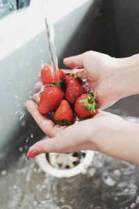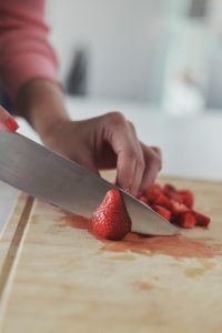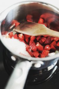 Накрая може да гарнирате с пресни плодове по ваш избор. Към тях аз реших да добавя и едно бързо домашно сладко от ягоди. Нарязах една шепа ягоди на едро, добавих им 1 с.л захар и ги сложих в касерола на среден огън. Идеята е захарта да се разтопи, ягодите да омекнат и да си пуснат соковете. Необходими са им около 2-3 минути. След това се оставят да изстинат напълно.